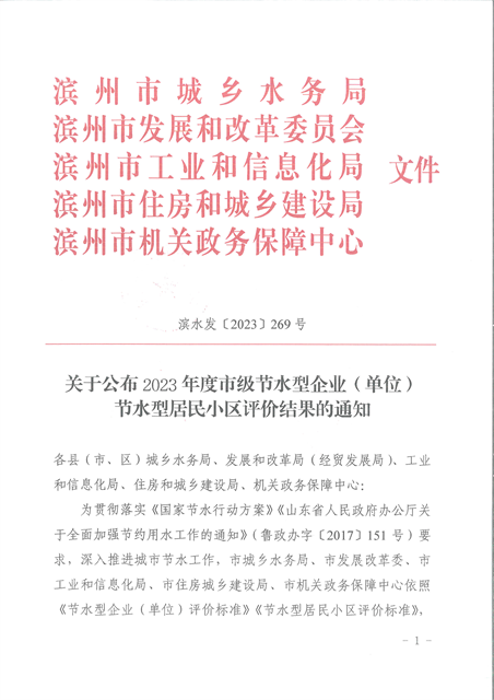 近日,濱州市城鄉(xiāng)水務(wù)局、濱州市發(fā)展和改革委員會(huì)、濱州市工業(yè)和信息化局、濱州市住房和城鄉(xiāng)建設(shè)局、濱州市機(jī)關(guān)政務(wù)保障中心發(fā)布了《關(guān)于公布2023年度市級(jí)節(jié)水型企業(yè)(單位)、節(jié)水型居民小區(qū)評(píng)價(jià)結(jié)果的通知》,經(jīng)綜合評(píng)價(jià),公司達(dá)到市級(jí)節(jié)水型企業(yè)(單位 )、節(jié)水型居民小區(qū)標(biāo)準(zhǔn)要求,獲評(píng)2023年度濱州市節(jié)水型企業(yè)。