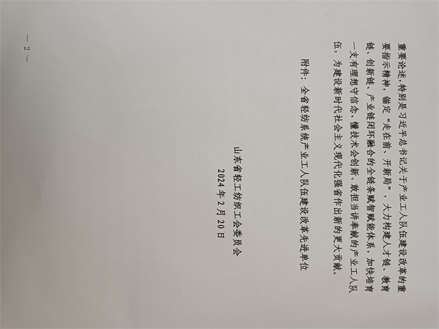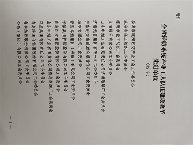 近日,省輕工紡織工會(huì)三屆四次全委會(huì)暨全省輕紡系統(tǒng)產(chǎn)業(yè)工人隊(duì)伍建設(shè)改革推進(jìn)會(huì)議在濟(jì)南召開。會(huì)上公布了全省輕紡系統(tǒng)產(chǎn)業(yè)工人隊(duì)伍建設(shè)改革先進(jìn)單位名單,公司工會(huì)委員會(huì)名列其中。
