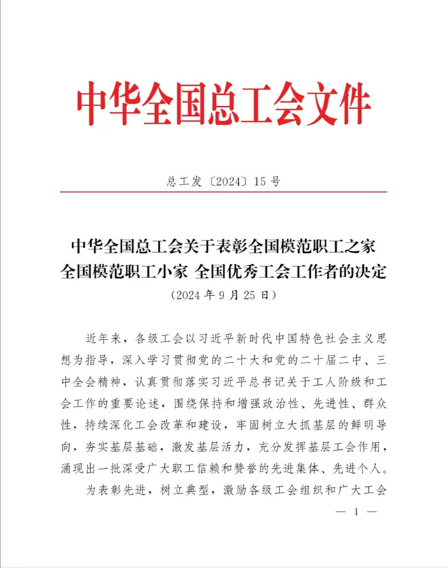 “全國模范職工之家”是中華全國總工會(huì)設(shè)立的授予全國工會(huì)系統(tǒng)先進(jìn)集體的最高榮譽(yù),是對(duì)基層工會(huì)工作的最高褒獎(jiǎng)和肯定。公司工會(huì)在公司黨委領(lǐng)導(dǎo)下,以習(xí)近平新時(shí)代中國特色社會(huì)主義思想為指導(dǎo),深入學(xué)習(xí)貫徹黨的二十大和黨的二十屆二中、三中全會(huì)精神,認(rèn)真貫徹落實(shí)習(xí)近平總書記關(guān)于工人階級(jí)和工會(huì)工作的重要論述,牢固把握正確政治方向,充分發(fā)揮橋梁紐帶作用,切實(shí)維護(hù)職工合法權(quán)益,努力構(gòu)建和諧勞動(dòng)關(guān)系,不斷增強(qiáng)工會(huì)組織的引領(lǐng)力、組織力、服務(wù)力,為公司高質(zhì)量發(fā)展貢獻(xiàn)工會(huì)智慧和力量。