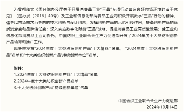 導(dǎo)讀:近日,中國紡織工業(yè)聯(lián)合會生產(chǎn)力促進(jìn)部發(fā)布了“2024年度十大類紡織創(chuàng)新產(chǎn)品‘十大精品’”名單、“2024年度十大類紡織創(chuàng)新產(chǎn)品”名單和“十大類紡織創(chuàng)新產(chǎn)品‘持續(xù)創(chuàng)新單位’”名