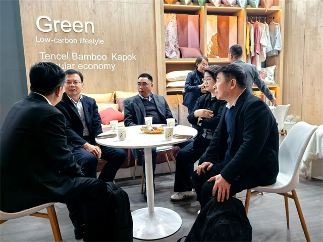 展會首日,中國紡織工業(yè)聯(lián)合會副會長楊兆華等領(lǐng)導(dǎo)專程到華紡股份展位參觀指導(dǎo)。領(lǐng)導(dǎo)們認(rèn)真聽取了家紡公司總經(jīng)理成汝海對家紡產(chǎn)品的介紹,仔細觀看了解了各類展品。楊兆華副會長對華紡股份有限公司在產(chǎn)業(yè)升級、產(chǎn)品結(jié)構(gòu)調(diào)整方面取得的成績給予了充分肯定,希望公司繼續(xù)加大研發(fā)投入,提升產(chǎn)品科技含量和附加值,進一步加強品牌建設(shè),提高中國家紡產(chǎn)品在國際市場的知名度和影響力。